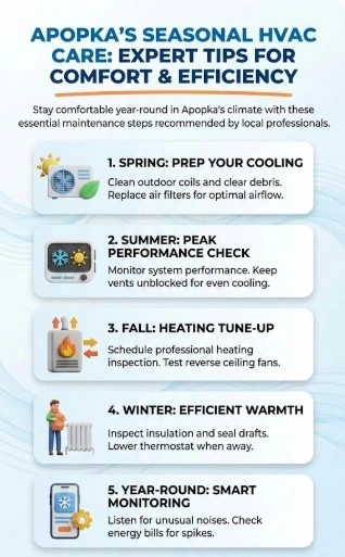 Apopka's climate demands more from HVAC systems than most regions. The technicians see the same pattern every year—units that skip spring tune-ups fail during June heat waves, clogged condensate drains cause summer flooding, and heat pumps that weren't tested in fall quit during the first cold front. After thousands of service calls across Orange County, we've learned that 80% of emergency repairs trace back to missed seasonal maintenance.